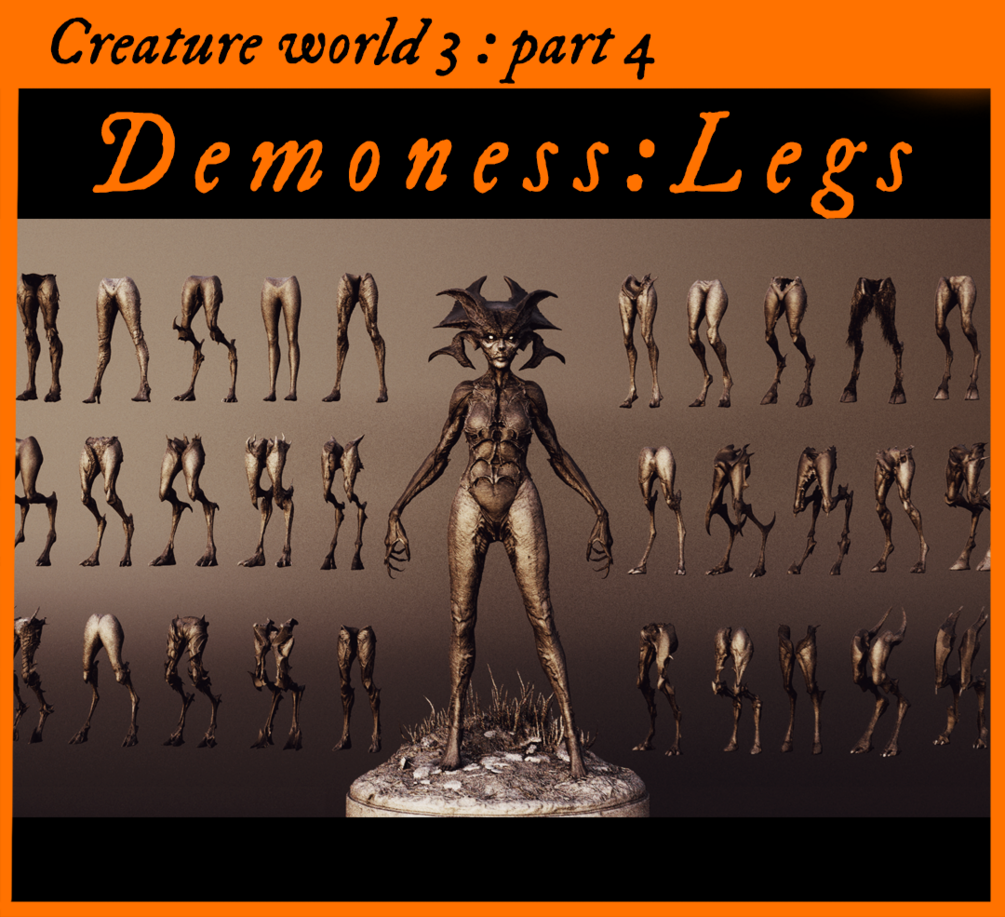 Quickly add on to or create numerous demonic and monstrous creatures and characters with these 30 high-detail legs, designed to e most effective when combined with Demoness Series 1 - 3 (Head, Torsos and Arms)